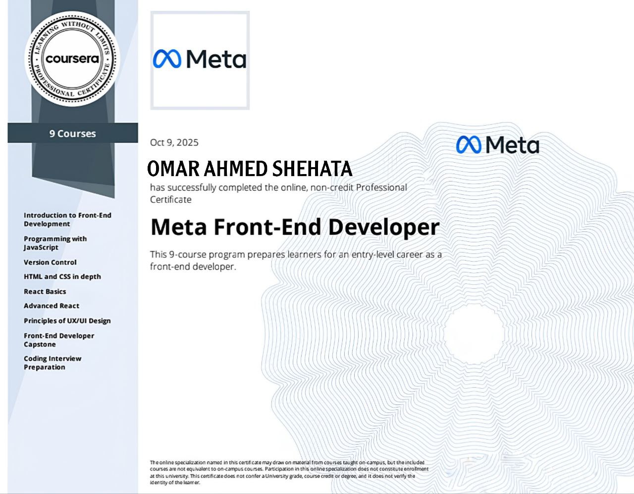 Hello! I'm Omar Shehata, a passionate and dedicated professional in the tech world. With a strong foundation in web development, I craft responsive and modern websites that deliver exceptional user experiences. My background in software engineering allows me to build scalable, high-performance applications, while my expertise in cybersecurity ensures that every solution I develop is secure and reliable. I'm always eager to learn, explore new technologies, and take on exciting challenges that push the boundaries of innovation.